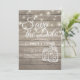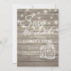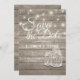 Save The Date Wedding Invitation Card Templates - Elegant Faux Gold Foil Save The Date Lettering Script and Vintage Mason Jar String Lights on Rustic Wood Background.