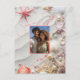 Save the Date postcard with your favourite photo. Beautiful tropical seashells, pink starfish, and pink and white pearls on a white sand beach. Perfect for your destination wedding.