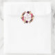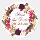 This beautiful burgundy watercolor florals and feathers wedding save the date sticker or envelope seal features burgundy, crimson, aubergine, and cream roses or peony type flowers with greenery leaves and branches in shades of olive green, rust, burnt orange, and brown, along with assorted colourful feathers in orange, purple, grey, and black. The customisable wording is in a gold and burgundy colour palette.