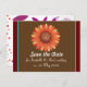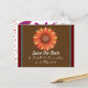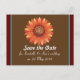 A "Save the Date" sunflowers postcard template. This is an illustration of a sunflower on a red & gold background which allows you to customised colour and text.