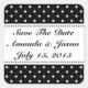 Save the date wedding stickers for wedding invitations. Classy black and white polka dot pattern design. Personalizable stylish text and elegant background colour.