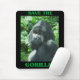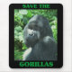 A close up of a beautiful adult gorilla in his natural habitat with the words Save the Gorillas surrounding it.