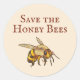 Save the Honey Bees stickers can be used on both sides of mason jars and glass containers to hold down each end of a wrap-around label or satin ribbon to create a "barbell" shaped security seal over the top lid of honey jars, featuring a realistic honey bee illustration.