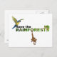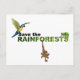 Save the Rainforests written in a colourful graphic with a macaw, a tree frog and a monkey surrounding it.