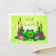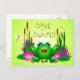 Save the Swamp postcard with Beulah the Frog, a true femme fatale of the frog world. She has bright red lipstick, blue eyeshadow, long eyelashes, charming green spots and a beauty mark. She's in her habitat, with pink lilies, dragonflies, cattails and green and purple marsh foliage. Wetlands are abundant with diverse wildlife and colourful flora, and are a vital source of natural resources. A portion of proceeds from every "Save the Swamp!" product sold goes towards environmental awareness and wetland conservation. Save the swamp and share the joy!