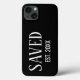 Christian Saved Established iPhone 13 Case with CUSTOMIZABLE YEAR and classic white serif typography. Perfect gift for Christians of all ages, and especially during Easter or for a newly saved person. Contact me if you're a church, faith-based organization, or business, and would like extra branding with your logo. Ideal personalized Christian Saved iPhone case for all ages. You can add your initials, too. Matching gifts available. Also in white.