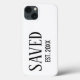Minimal Saved Established Christian iPhone 13 Case with CUSTOMIZABLE YEAR and classic black serif font. Perfect gift for Christians of all ages, and especially during Easter or for a newly saved person. Contact me if you're a church, faith-based organization, or business, and would like extra branding with your logo. Ideal personalized Christian Saved iPhone case for all ages. Matching gifts available. Also in black.