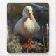 A photograph of a Saxony duck standing by the edge of the pond and staring at the camera.