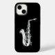 Design with charcoal illustration of saxophone on black background; elegant simple jazz musical instrument design