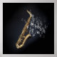 Saxophone on black background with musical notes flying out the bell. Visual representation of brass music