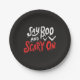 Funny Halloween Party Paper Plate with "Say Boo and Scary On" quote.