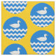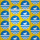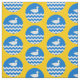 "Per fess wavy azure and barry wavy argent and azure, a duck naiant contourny argent billed or." Allover pattern of the populace badge for the Barony of An Dubhaigeainn in the Society for Creative Anachronism.