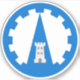 "Argent, on a pile inverted throughout azure a tower argent, within a bordure embattled azure."