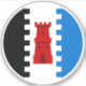 "Per pale sable and azure, on a pale bretassy argent, a tower gules."