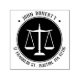 Stamp with scales of justice symbol and round address.
