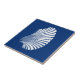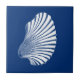 Ceramic tile in a block print, of a single scallop shell, in white on a cobalt / navy blue background