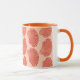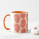 Mug in a block print pattern, based on a scallop shell, in coral orange on a pastel coral background