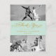 This modern and classy wedding thank you postcard features a 3 photo collage design layout. The top part accommodates a larger landscape photo and the bottom accommodates 2 portrait photos side by side. The middle of the card is adorned with a classic coloured scalloped band with an elegant and whimsical 'thank you' script.