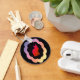This design was made using Photoshop. The backround is a black frame with a cutout that shows a rainbow of colours. A black circle with a scalloped edge shows a cat designed with a red tint. This key chain is strong but is a basic key chain. Change the backround colour if you want or leave the colour to where it is.