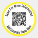 A display image is in the centre of the sticker. You can replace it with your QR code. There are two lines of black display text that you can edit to show your custom message. (Shown: Scan For More Information Add Company Name Here) These stickers have black text in a white circle. The sticker has a bright yellow border.