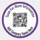 A display image is in the middle of the sticker. You can replace it with your QR code. There are two lines of black display text that you can edit to show your custom message. (Shown: Scan For More Information Add Company Name Here) These stickers have black text in a white circle. The sticker has a royal purple border.