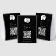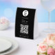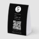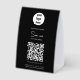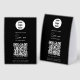 A modern business paper table tent sign design showcasing your business logo, business qr code, business website and social media handle as well as contactless menu or ordering option. A minimalist personalized scan to pay QR code, business logo and social media business table tent signs. A simple and professional way to allow your customers to scan, pay, view menus, price lists etc. Customize the text and make it your own..