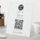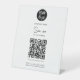 A modern business pedestal sign design showcasing your business logo, business qr code, business website and social media handle as well as contactless menu or ordering option. A minimalist personalised scan to pay QR code, business logo and social media business signs. A simple and professional way to allow your customers to scan, pay, view menus, price lists etc. Customise the text and make it your own..