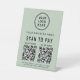 Modern sage green table top pedestal sign for your business with 2 QR codes for customers to scan for payments, enabling you to receive payments anytime, anywhere. Upload your logo and QR codes, and add your business name, phone number and street address or other information in simple typography.