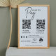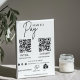 In a modern minimalist style, a simple custom white business scan to pay with QR code pedestal sign. The adaptable template is readily customisable with QR codes, custom text, payment icons, and social media icons.
