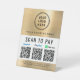 Modern faux metallic gold table top pedestal sign for your business with Venmo, Paypal and CashApp QR codes for customers to scan for payments. Add your logo, QR codes, and business name, phone number and street address or other information.