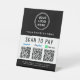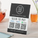 Simple modern black and white table top pedestal sign for your business with Venmo, Paypal and CashApp QR codes for customers to scan for payments. Add your logo, QR codes, and business name, phone number and street address or other information.