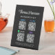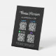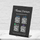 Custom black pedestal tabletop sign for your business with your name or brand in a stylish white signature script and Venmo, Paypal, Zelle and CashApp QR codes for customers to scan for payments. Upload your QR codes and add your contact information in simple white lettering.