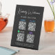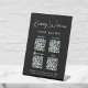 Chic black pedestal tabletop sign for your business with your name or brand showcased in a stylish white signature script and Venmo, Paypal, Zelle and CashApp QR codes for customers to scan for payments. Upload your QR codes and add your contact information in clean white lettering.