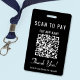Get paid anywhere you do business with this clean, professional black Scan to Pay QR Code Badge. This lightweight badge lets customers send payment instantly with a quick scan -- perfect for mobile service, busy events, and on-the-go checkout. The minimalist layout features a bold call-to-action, a clearly centered QR code, a friendly “Thank You” message and modern white lettering. Upload your QR code, and add your payment app name and business name for a polished, branded look. Ideal for vendors, artists, bartenders, hair stylists, makeup artists, delivery drivers, market sellers, and event staff, this wearable payment badge keeps checkout fast, contactless, and convenient -- no counter space needed.
