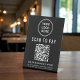 Simple modern black table top pedestal sign for your business with a QR code for customers to scan for payments. Add your logo, business name, QR code, phone number and street address in simple white typography.