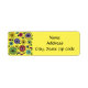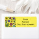 These return address labels have a scandi design of flowers made from circles, ovals, and half-circles with starbursts on them and leaves in periwinkle, yellow, green, turquoise, magenta, rust, and blue.