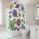 This shower curtain has a Scandinavian-inspired design of flowers made from circles, ovals, and half-circles with starbursts on them and leaves in periwinkle, yellow, green, turquoise, magenta, rust, and blue.