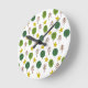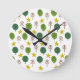 This wall clock has a Scandinavian repeating design of a forest in brown and shades of green and yellow stars.