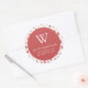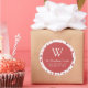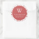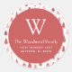 This modern return address sticker features a dusty rose circle on a whimsical, Scandinavian-inspired pattern of pink, rose and burgundy evergreen pine trees on a white background. Personalise the design with your monogram initial and family name in white serif font, with your address below in sans serif.