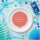 Simple, stylish and fun kids birthday party plate with your custom name text in modern typography in crisp white on a simple round balloon design in coral pink with a straight grey string in a minimalist Scandinavian 'Scandi' style. Add your kids name or the name of a loved one's child for a truly unique and bespoke party!