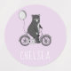 Modern, cute, minimalist Scandinavian design features bear on bike with balloon on pastel purple background. Customise with child's name or other special message