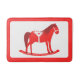 This awesome Christmas bath mat features a digital art image of a cute Scandinavian style rocking horse. The horse is red with a dark red mane, tail and hooves. The friendly horse is smiling. It has a white saddle and reins with pretty red Scandi folk style patterns on the saddle including the sun, moon and stars and hearts and flowers. The base of the rocking horse is red and is covered in pretty white leaves. The design was inspired by the Swedish Dala horse.