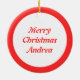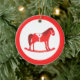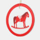 This awesome Christmas ornament features a digital art image of a cute Scandinavian style rocking horse. The horse is red with a dark red mane, tail and hooves. The friendly horse is smiling. It has a white saddle and reins with pretty red Scandi folk style patterns on the saddle including the sun, moon and stars and hearts and flowers. The base of the rocking horse is red and is covered in pretty white leaves. The design was inspired by the Swedish Dala horse. There is custom text on the back so you can include a name or message.