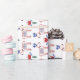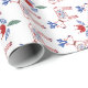 Holiday wrapping paper with a hand-drawn pattern of red tulips and reindeer painted with flowers and leaves in red, blue, and green.