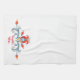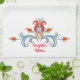 This Scandinavian inspired Kitchen Towel features a floral folk art design done in the traditional Scandinavian tole painting style. The border around the front of the towel has a blue swirl design with yellow, grey and red flowers on a white background. This towel coordinates with the "Velkommen" Home Collection and can be personalised with your first name!