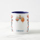 This is an attractive monogram mug that is perfect for the Holiday Season and all winter. It features a deer or reindeer with a pretty blue teal and rust nordic pattern. The image is printed twice on the mug, with a trio of decorated tree bulbs hanging between them. Your monogram or name is in teal blue at the centre bottom.