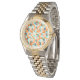 This women's watch has a Scandinavian design of flowers and leaves in various shades of orange and teal.