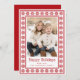 A Happy Holidays or Merry Christmas photo greeting card with a Scandinavian style pattern border, custom name, single photo template and customizable text "Happy Holidays". White pattern and text on a dark red background.