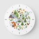 Scandinavian folk art style nature illustrations (woodland; fox, leaves, trees, flowers, mountains and birds) in a circular design, with clock surround. With clock surround.