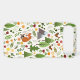 Scandinavian folk art style nature illustrations (fox, leaves, trees, flowers, mountains and birds) in a surface pattern design on a light cream color background.